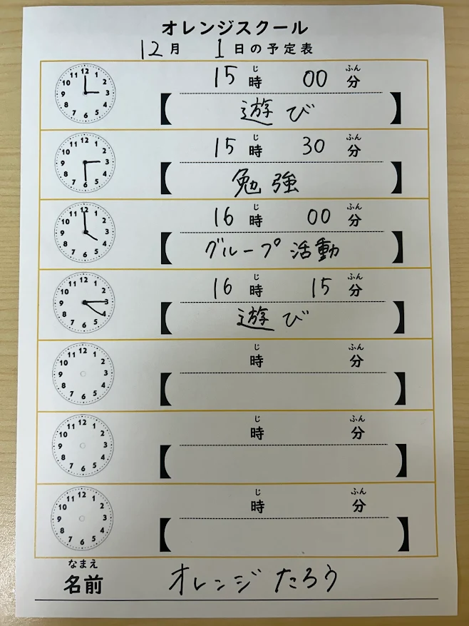 オレンジスクールでは「時間の見通しを立てる」練習として、登校してすぐに予定表を書きます。