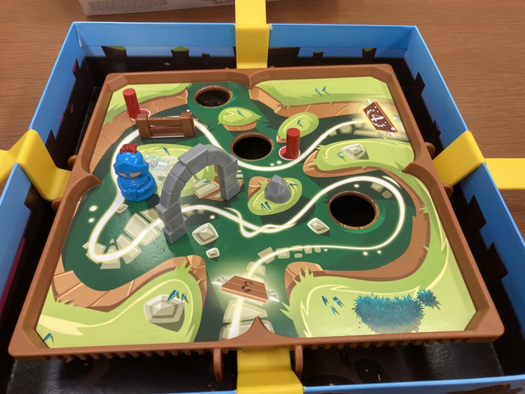 横にある黄色のレバーを傾けることで勇者のコマがスライドしていきます。【コマが落ちないようにバランスに気を付けながらゴールを目指す】ゲームです。