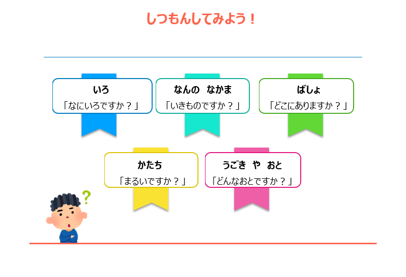 質問する力を育てるたり、具体的にどのような質問をしたらよいのか分からないお子さんのために、このような項目や例を挙げたシートを用意しました。