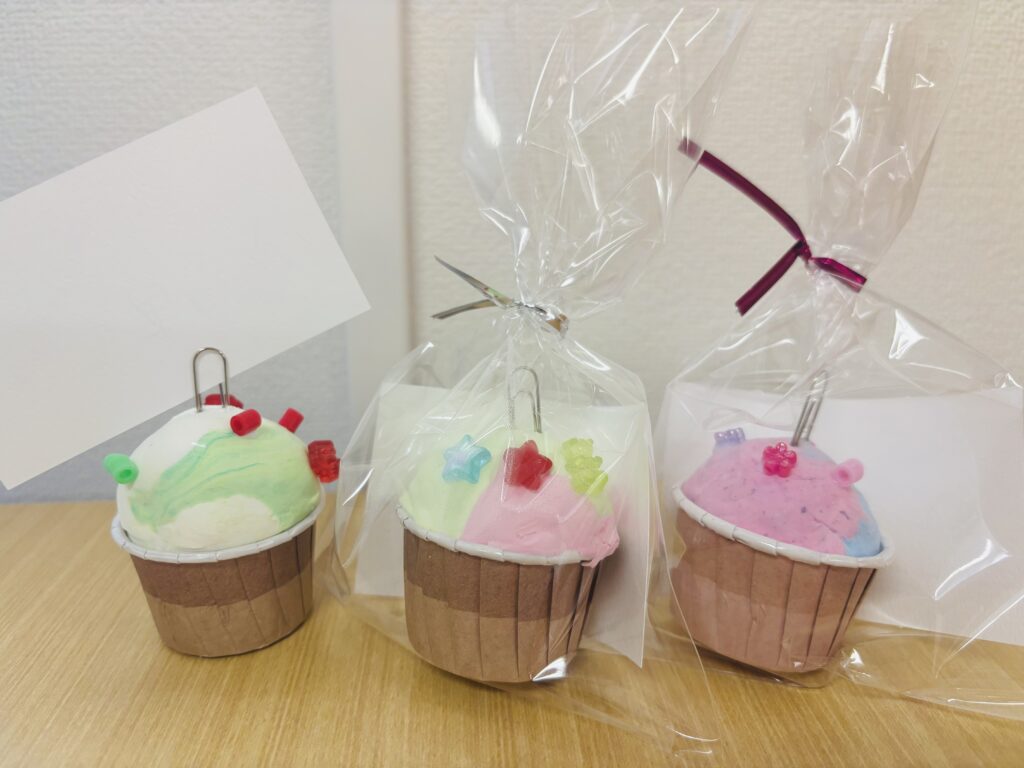 紙粘土やカップケーキ型を使ってアイスクリームをイメージしたメモスタンドを作りました。