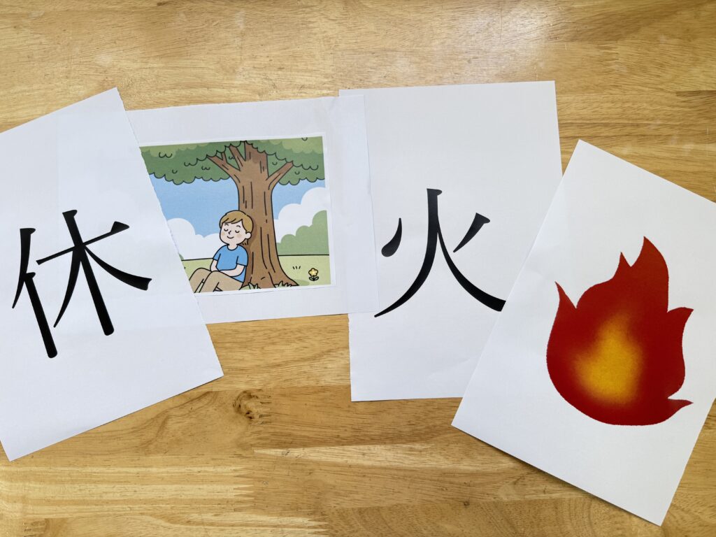 「休」という漢字なら、人が木にもたれて休んでいる絵を文字の横に添えます。