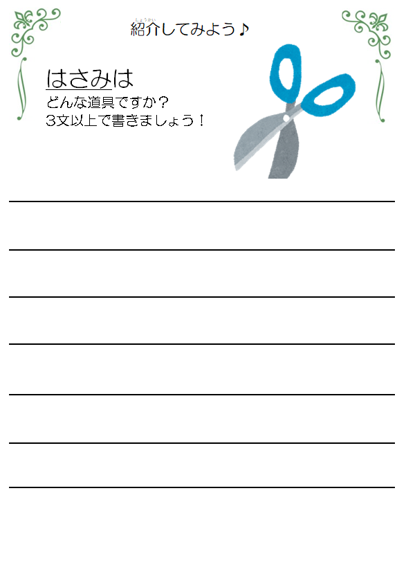 「はさみ」「えんぴつ」「うちわ」など、毎日目にするものを「どんな道具かな?」と3文以上で説明します。