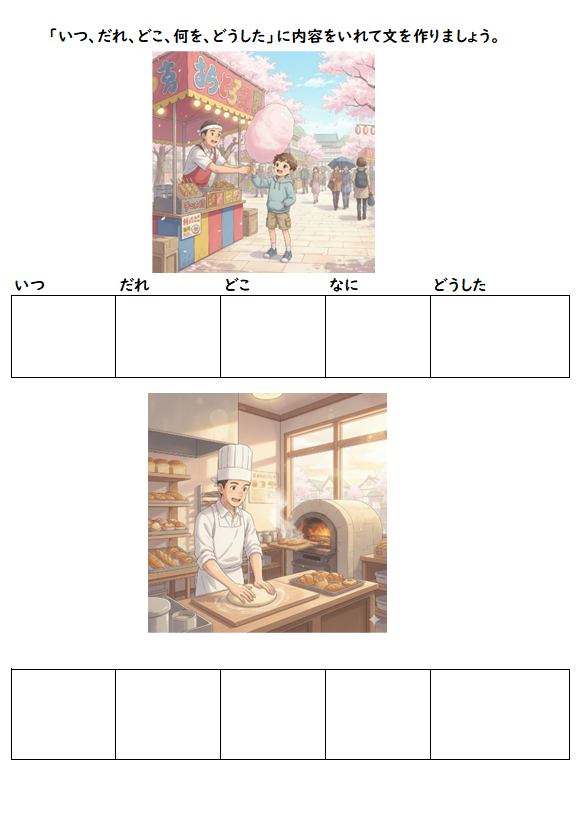 まず最初にご紹介するのは、イラストを見て「いつ・だれが・どこで・何を・どうした」を埋めていくプリントです。