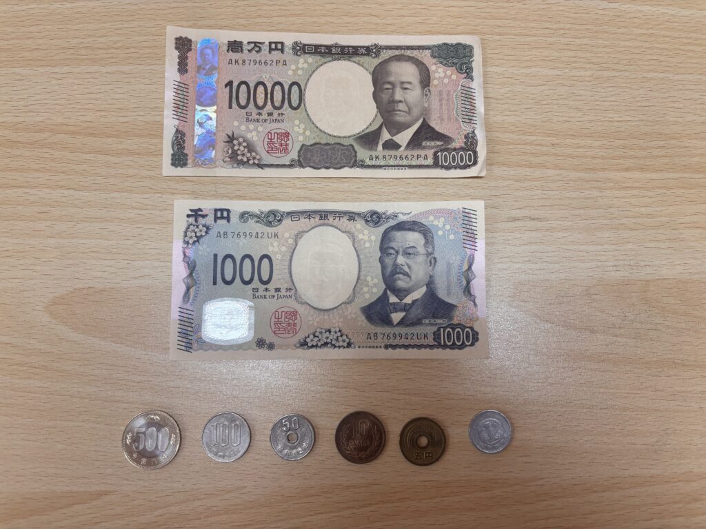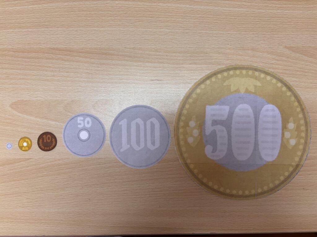お金実物の大きさを比べていただき、大きさ・金額を理解していただきます。