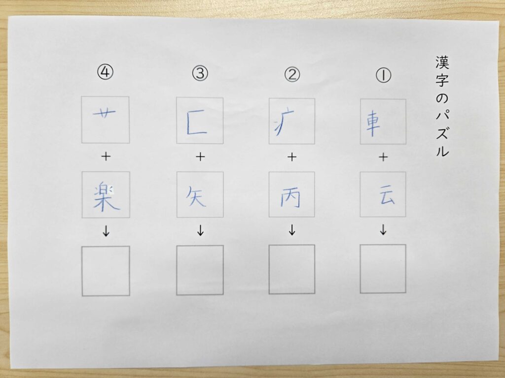 先ほどご紹介したプリントの漢字パズルと似ていますが、こちらは特に部品の配置やバランスを視覚的に捉えることができます。