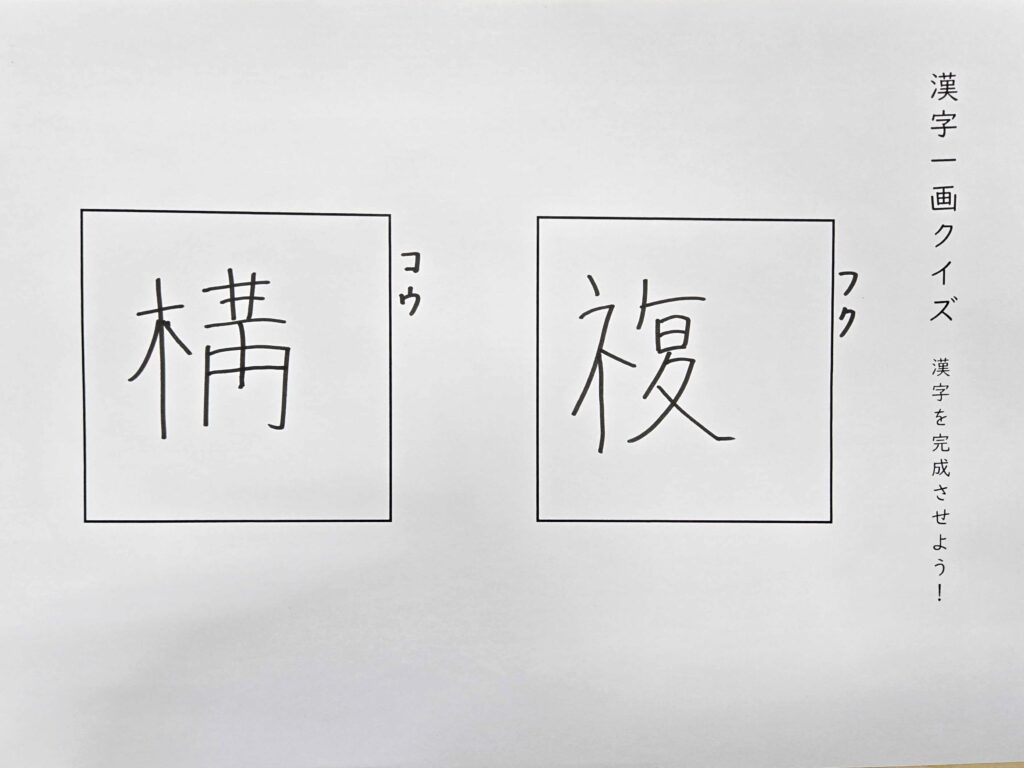「漢字一画クイズ」は、欠けている一画(またはパーツ)を探し、漢字を完成させる教材です。