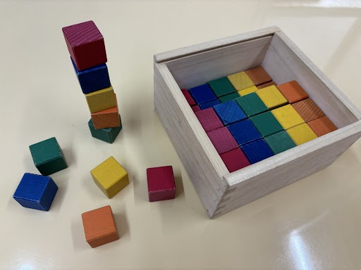 指導員が作ったタワーをよく見て、同じ形・同じ順番で積み上げたり、いっぱいの積み木をお友達と半分に分けたりする活動です☆