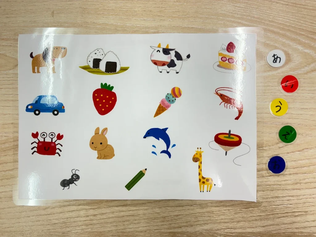 指導員が言った文字から始まる言葉を、イラストの中から探す活動を行いました。