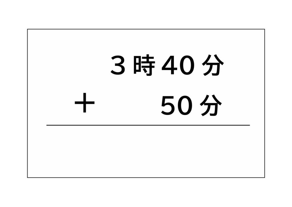 問:3時40分から遊びはじめて、50分経ちました。今の時刻は何時何分ですか。