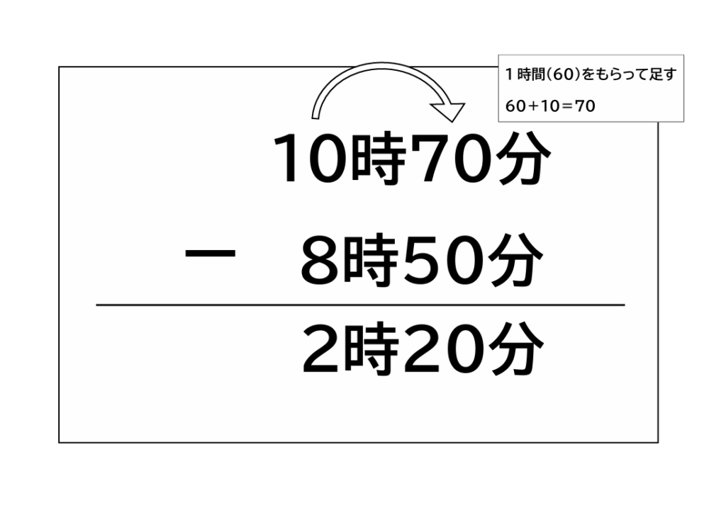 最後に時間の計算では、1時間(60分)を右隣に渡したため「10時-8時」を行うことを確認します。